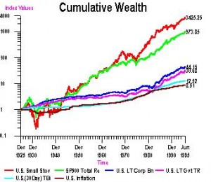 This chart shows the relative value of several asset classes from 1925 to 1995. The dark red line at the bottom is US inflation, while the bright green line is the S&P 500. Over time, the increased risk of investing in the S&P 500 has produced dramatically higher rewards relative to more stable investments, such as US Long Term Treasury Bills (the pink line).