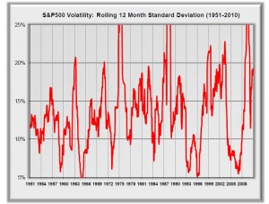 The past few years have been quite a roller-coaster, but the levels of volatility we’ve seen are not without precedent. As you can see from this chart, the 12 month rolling volatility from 1951 to 2010 has averaged about 15 percent, but high spikes and drops are not all that uncommon[ii]: